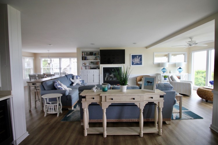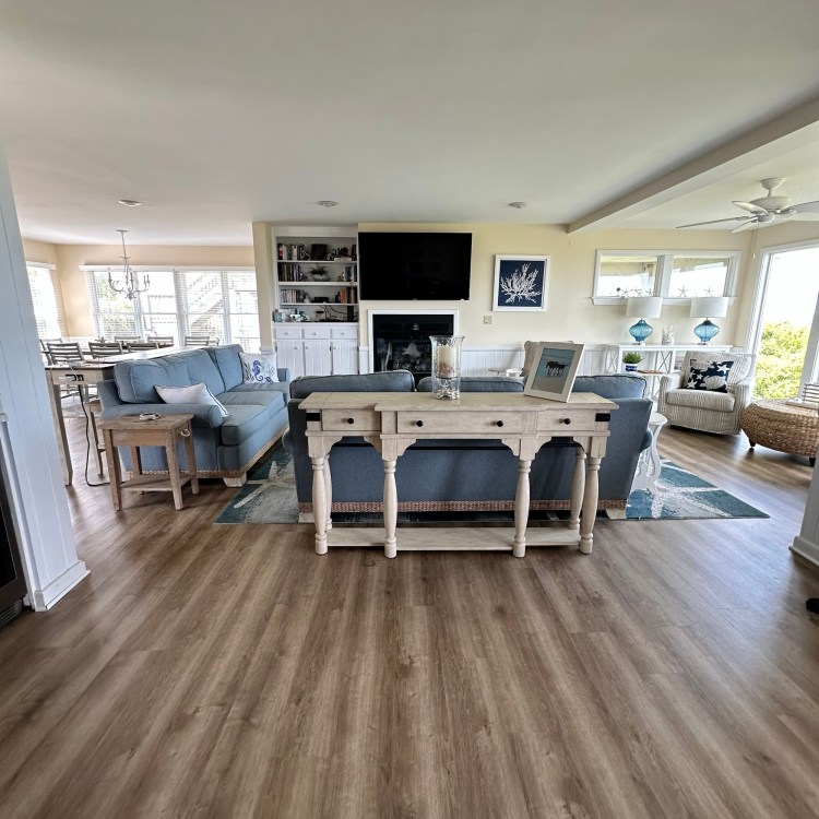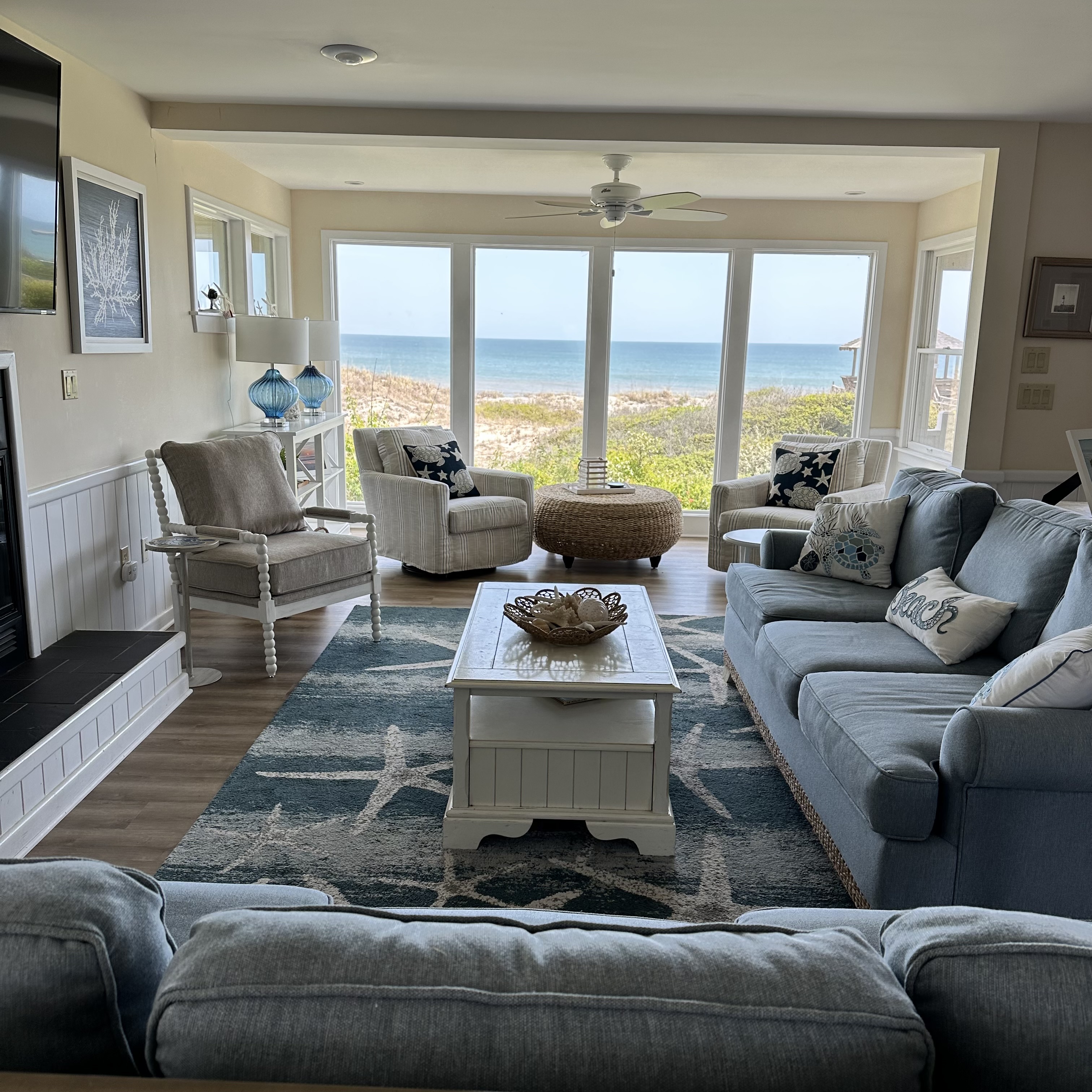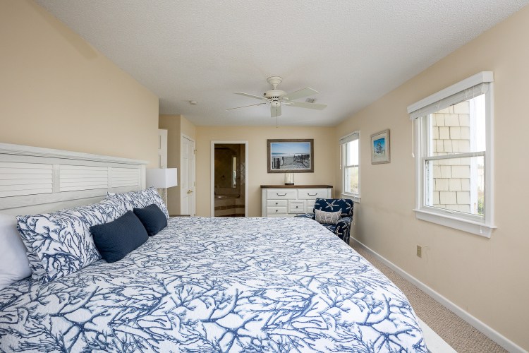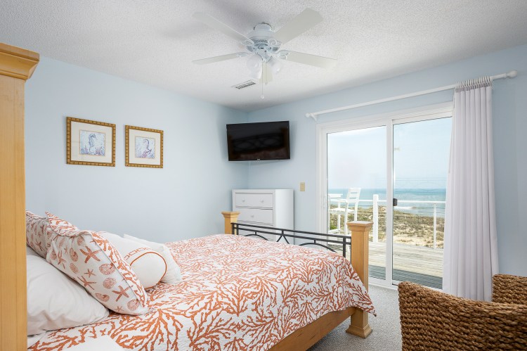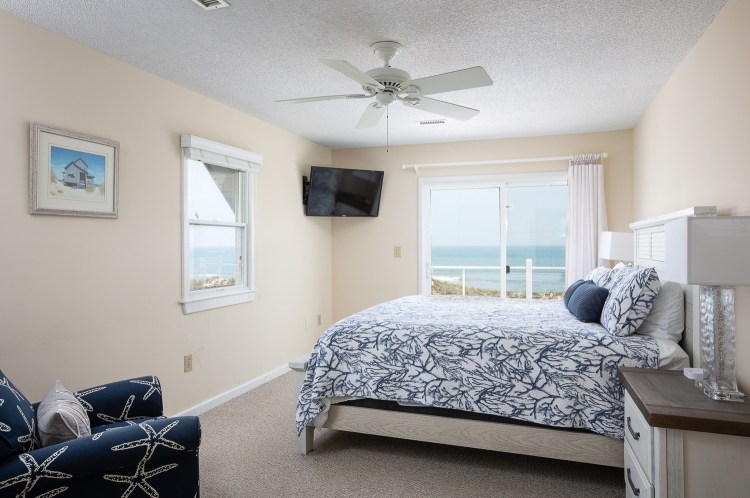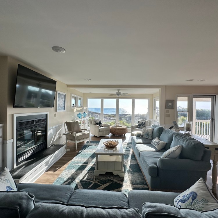 Gather your entire “Shore Crew” and head to this well-appointed beach house on the oceanfront! Gorgeous ocean views are yours to enjoy from the top two levels of the home. With a spacious layout, inside and out, this home has all that you need for a relaxing Outer Banks vacation. The ocean view is on full display in the great room on the middle floor of the home. Gaze out of the floor-to-ceiling windows in the living area as pelicans fly by above the beach. The home’s main living area features large floor-to-ceiling windows, a 65″ TV with access to hundreds of cable and streaming channels, a video and book library, and plenty of games and puzzles.