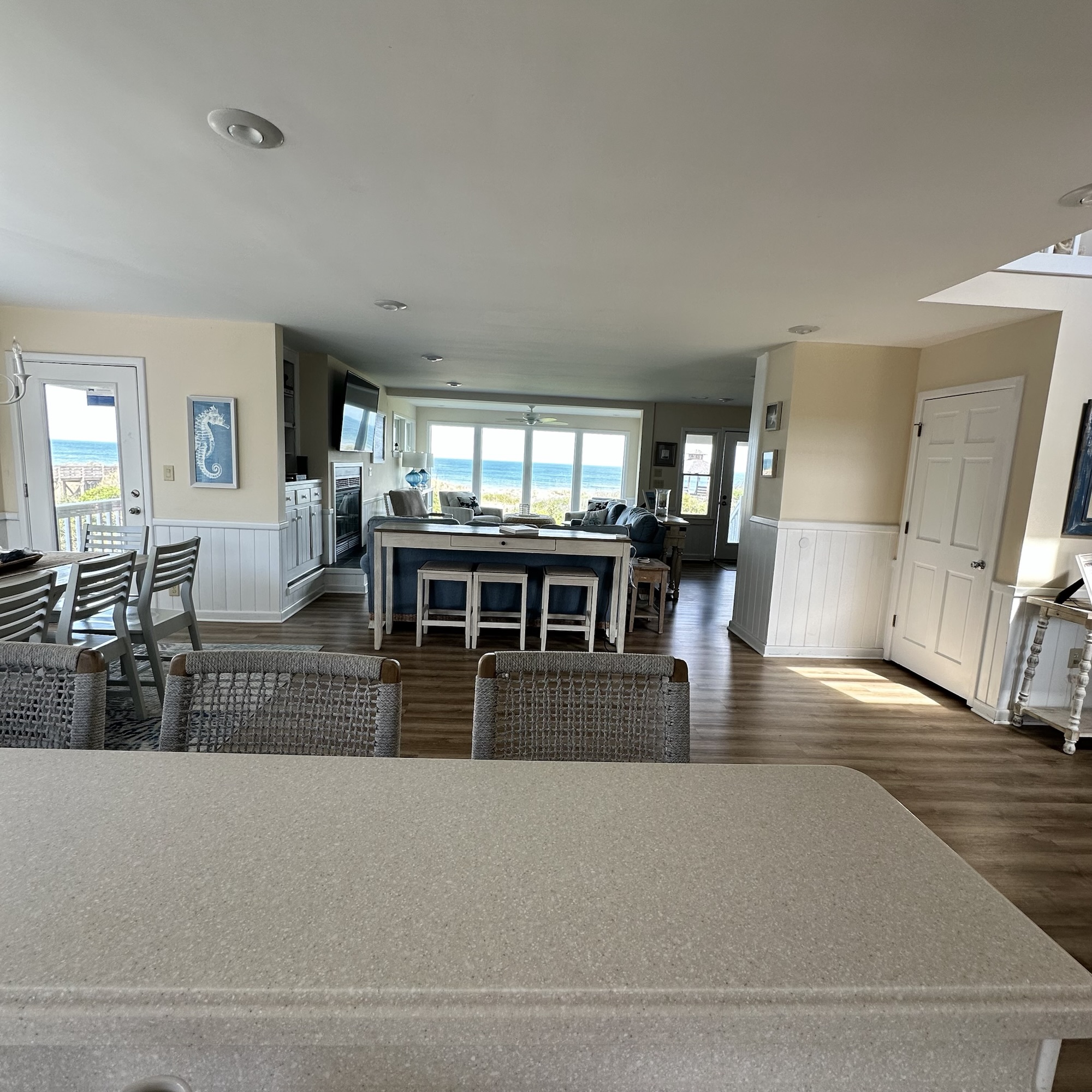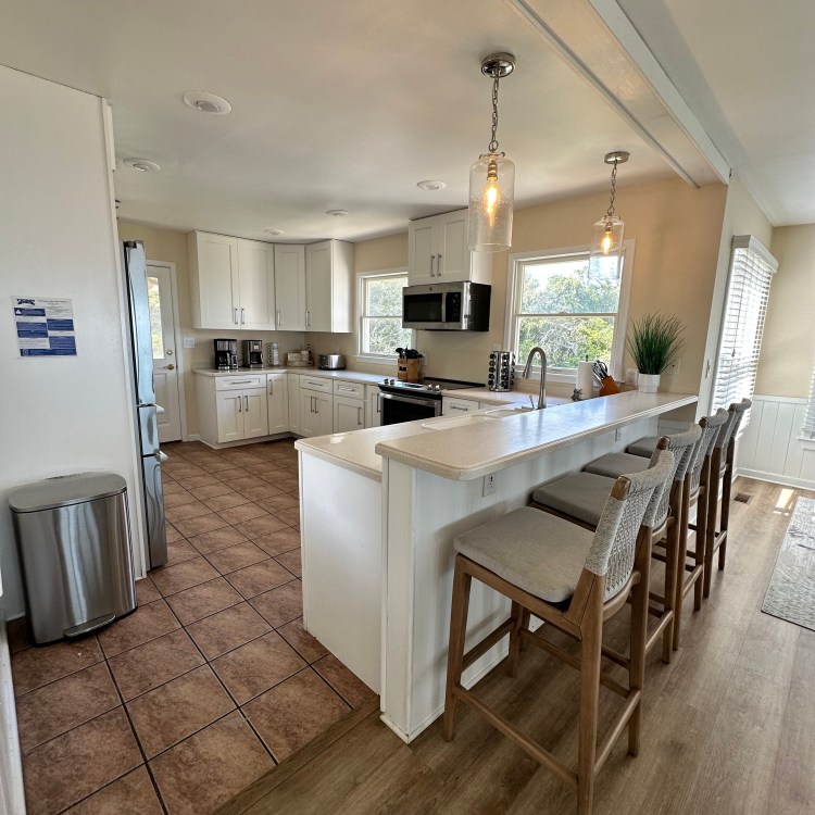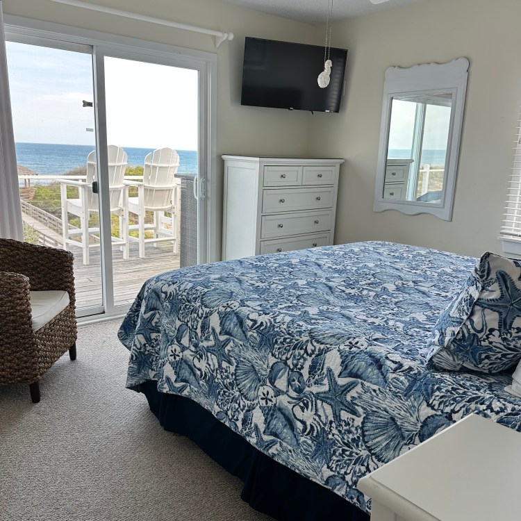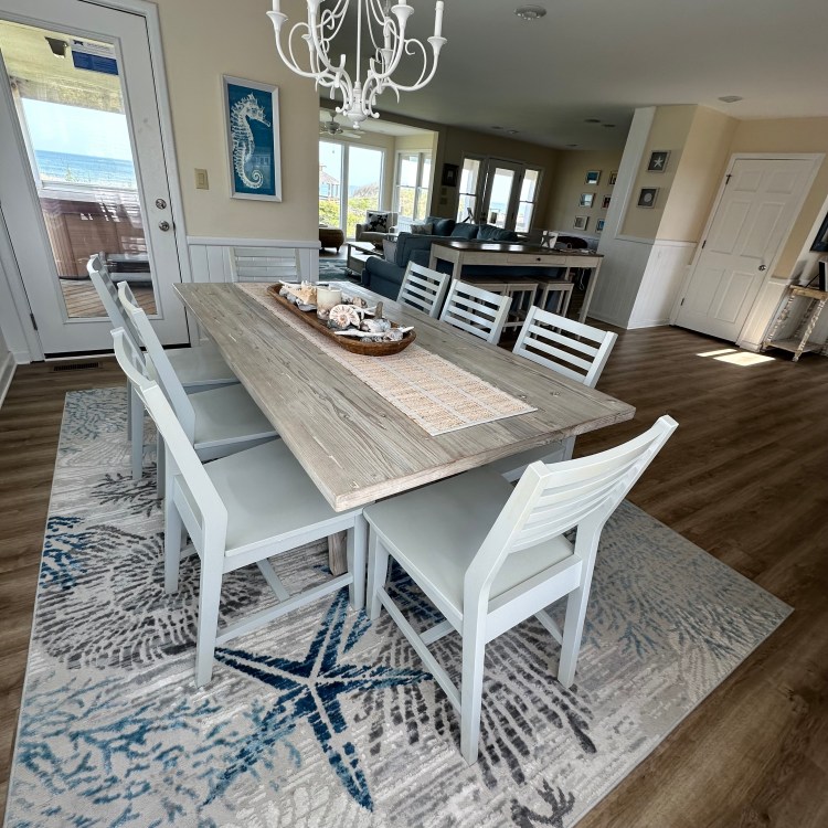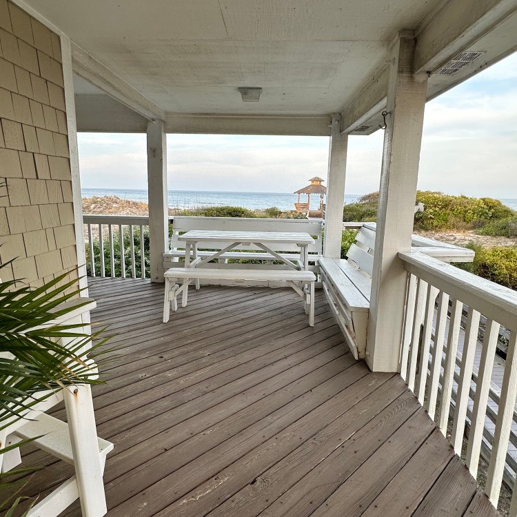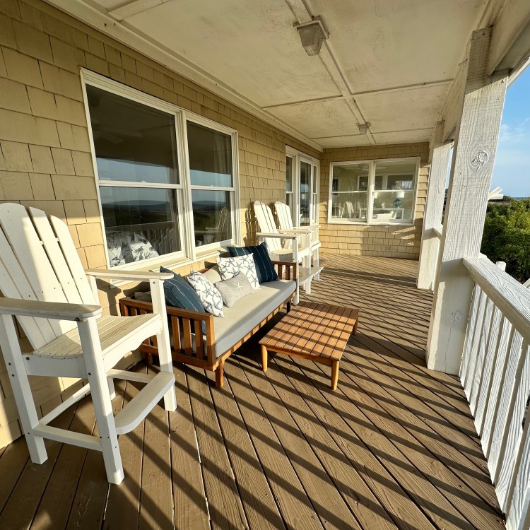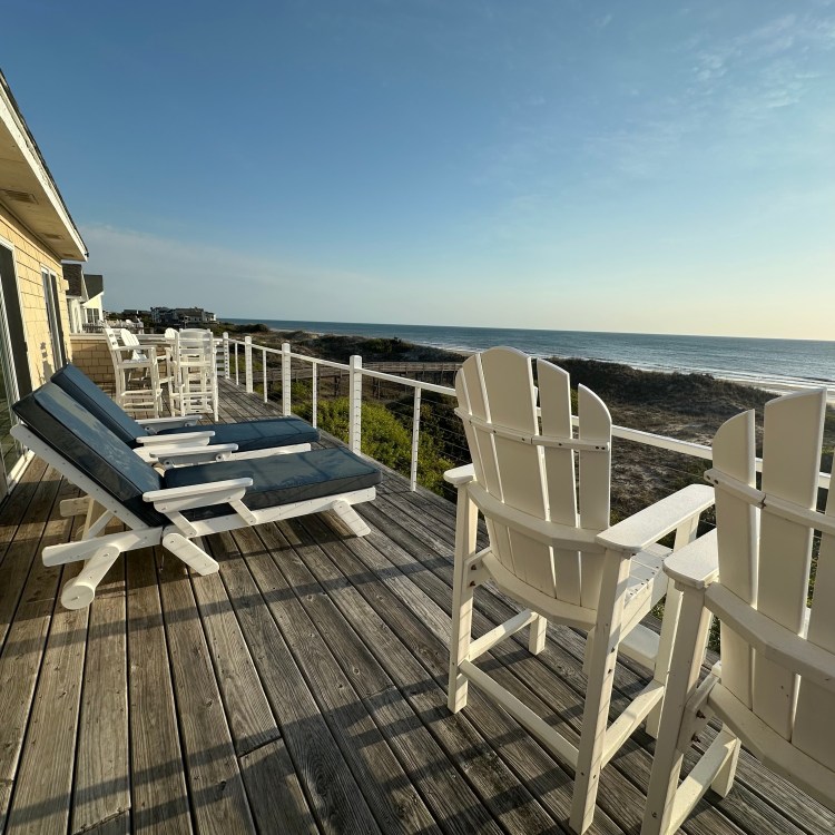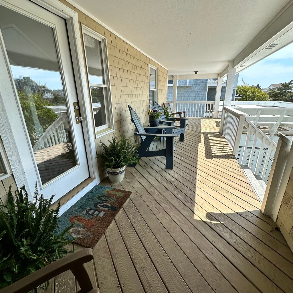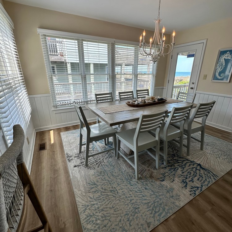 The house was recently updated in 2023 with new flooring, a new dining table/ chairs, new kitchen & bar cabinets, and bar stools that lead to a well-equipped kitchen with stainless steel appliances and new kitchen cabinets. The attractive kitchen is fully equipped with all that you need to prepare meals during your vacation. Watch the waves and dolphins while preparing meals and enjoy them together in the dining area, or dine outdoors on the screened porch. Outside, the expansive wrap-around decks are a highlight of the home. A mixture of outdoor furniture and built-in bench seating can be found throughout the deck. Enjoy your morning coffee with a beautiful sunrise over the ocean as you relax on the ocean-facing covered deck. The sun deck on the front of the house is also a great place to chat with family and listen to the waves crash nearby.
