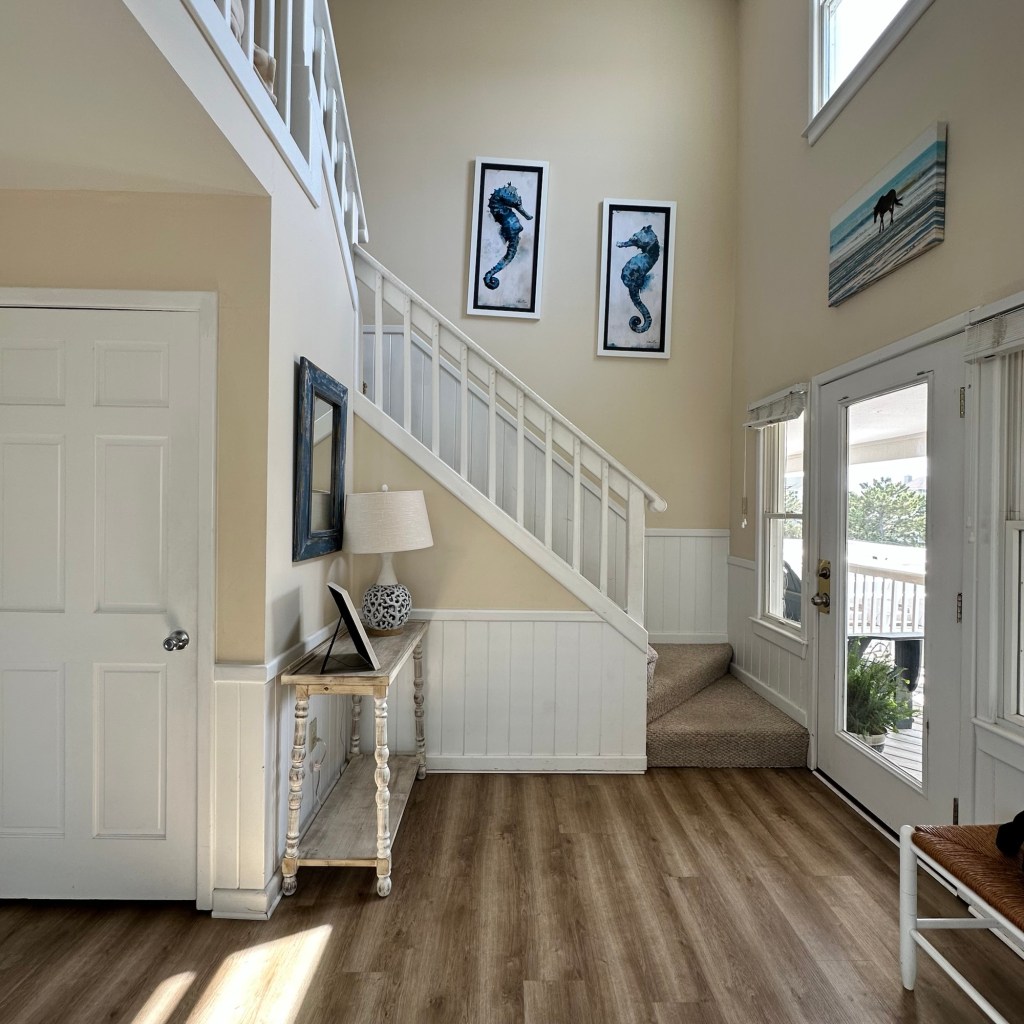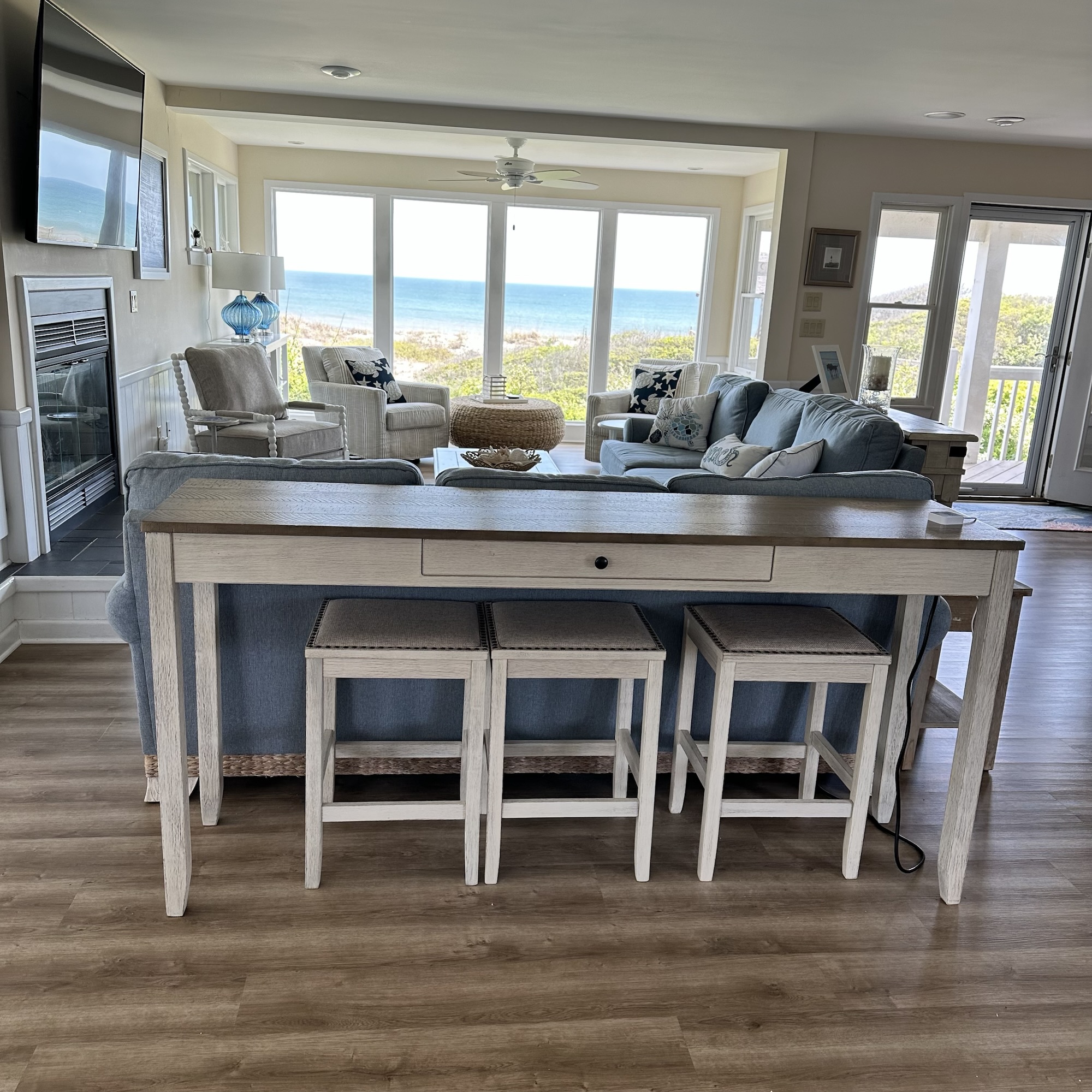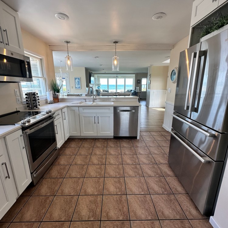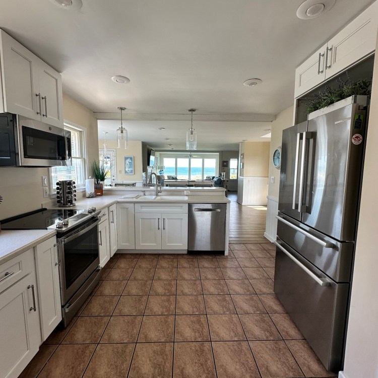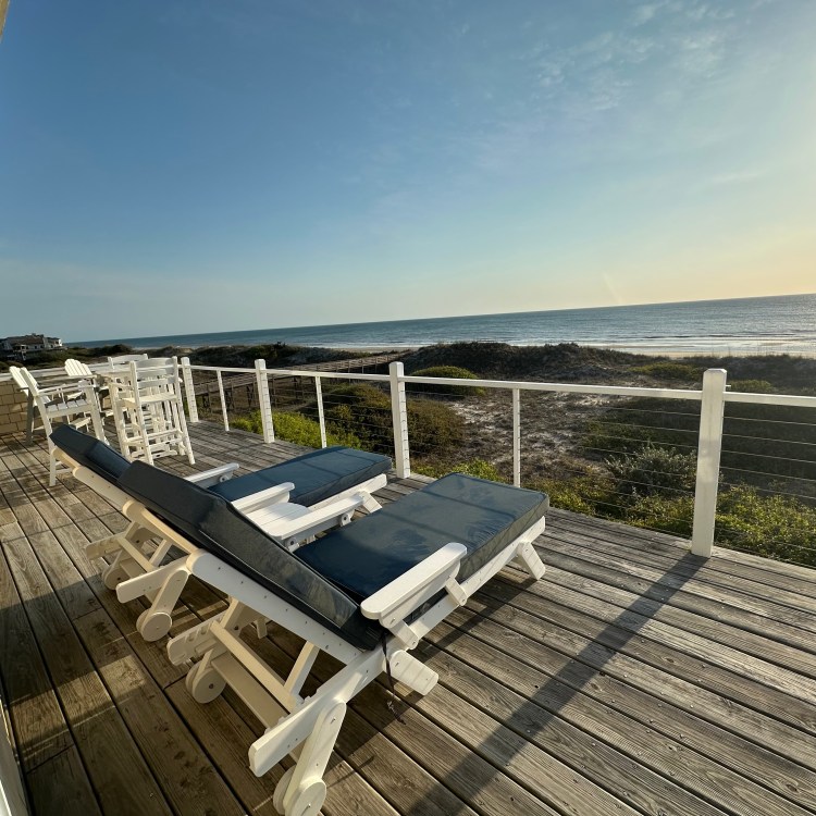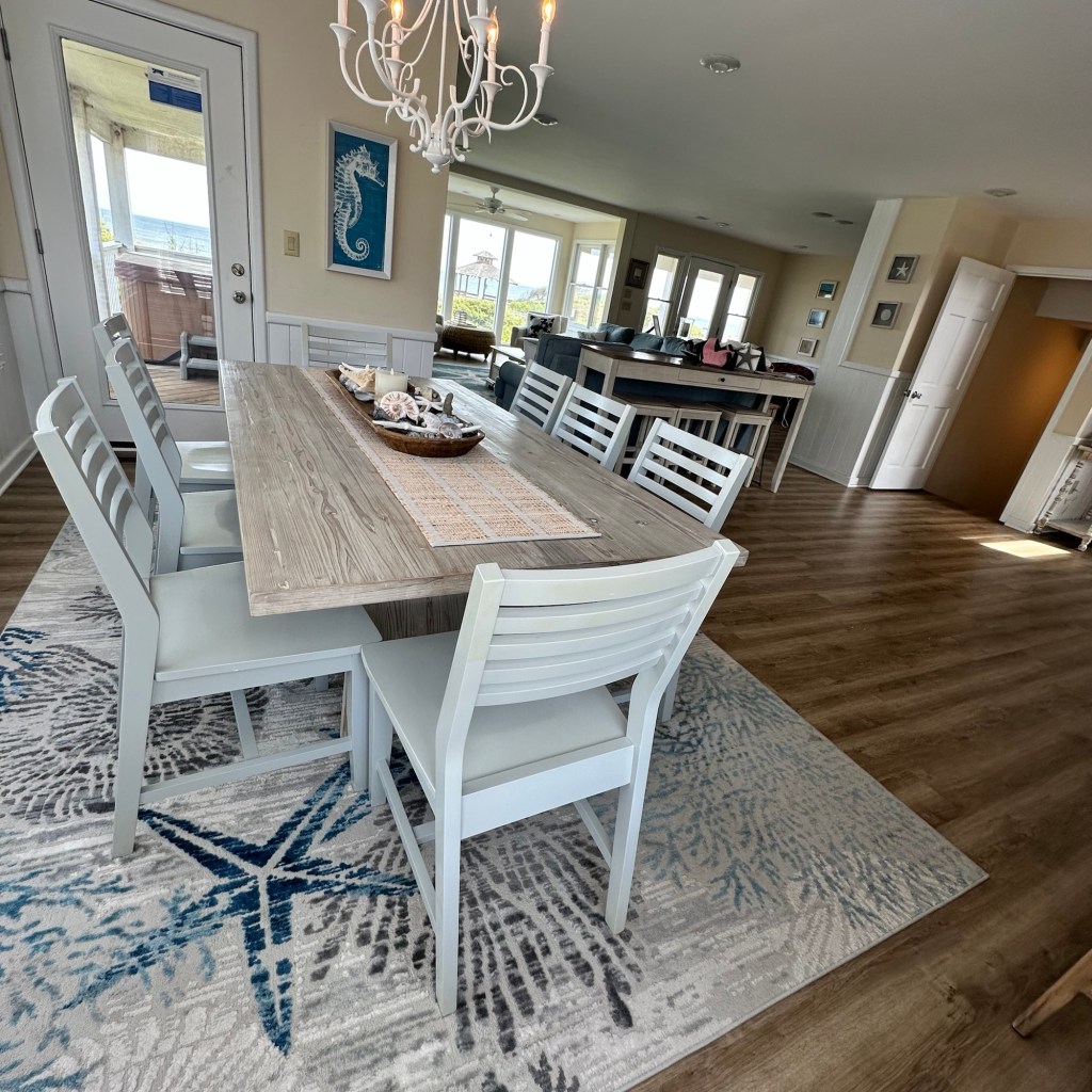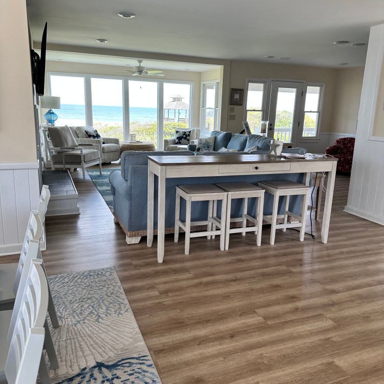 The house was recently updated in 2023 with new flooring, a new dining table/ chairs, new kitchen & bar cabinets, and bar stools that lead to a well-equipped kitchen with stainless steel appliances and new kitchen cabinets. The attractive kitchen is fully equipped with all that you need to prepare meals during your vacation. Watch the waves and dolphins while preparing meals and enjoy them together in the dining area, or dine outdoors on the screened porch. Outside, the expansive wrap-around decks are a highlight of the home. A mixture of outdoor furniture and built-in bench seating can be found throughout the deck. Enjoy your morning coffee with a beautiful sunrise over the ocean as you relax on the ocean-facing covered deck. The sun deck on the front of the house is also a great place to chat with family and listen to the waves crash nearby.