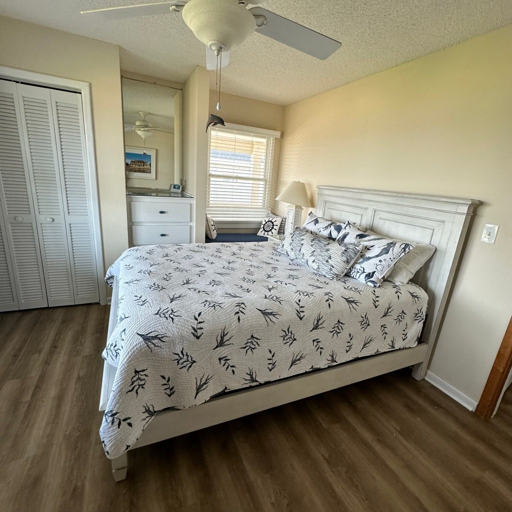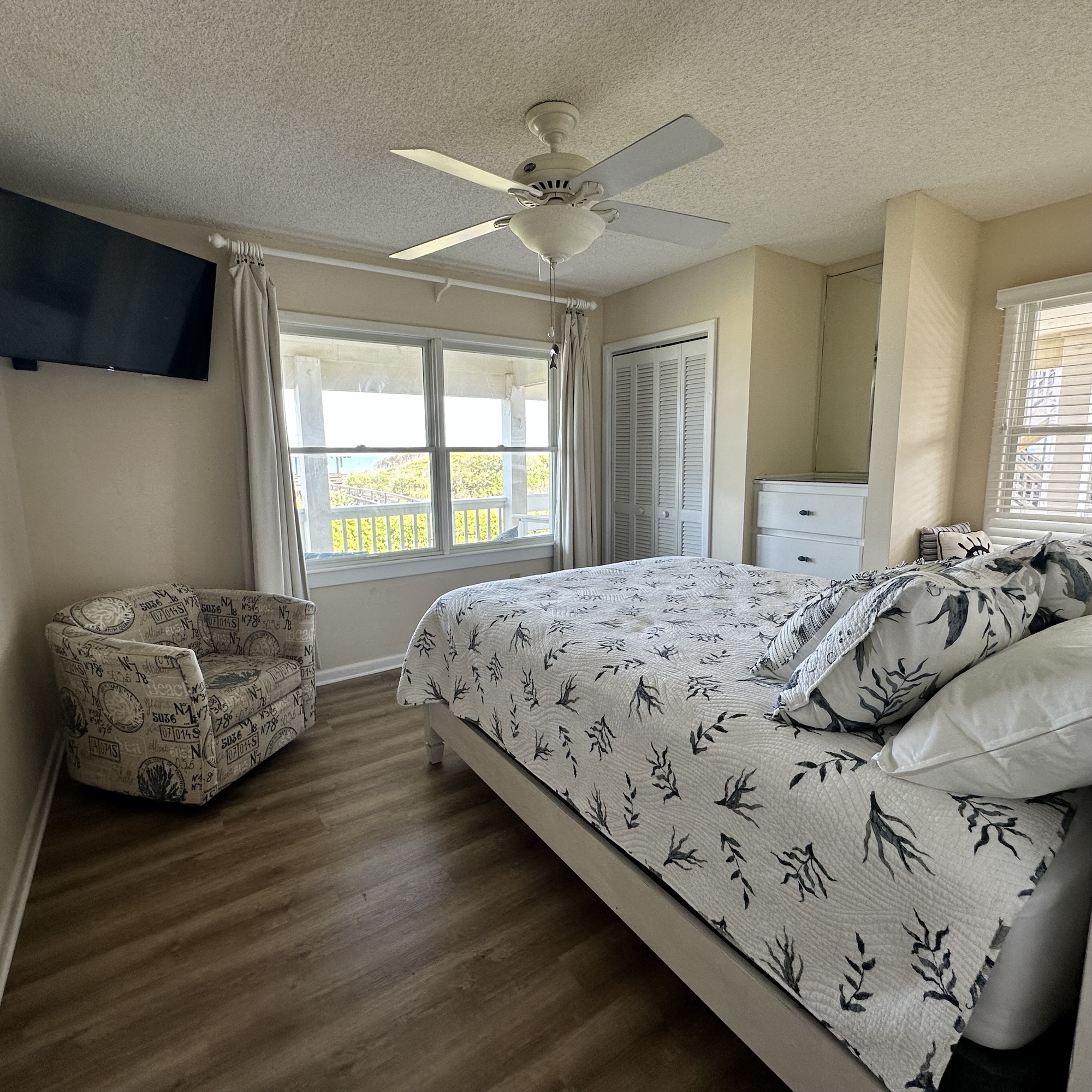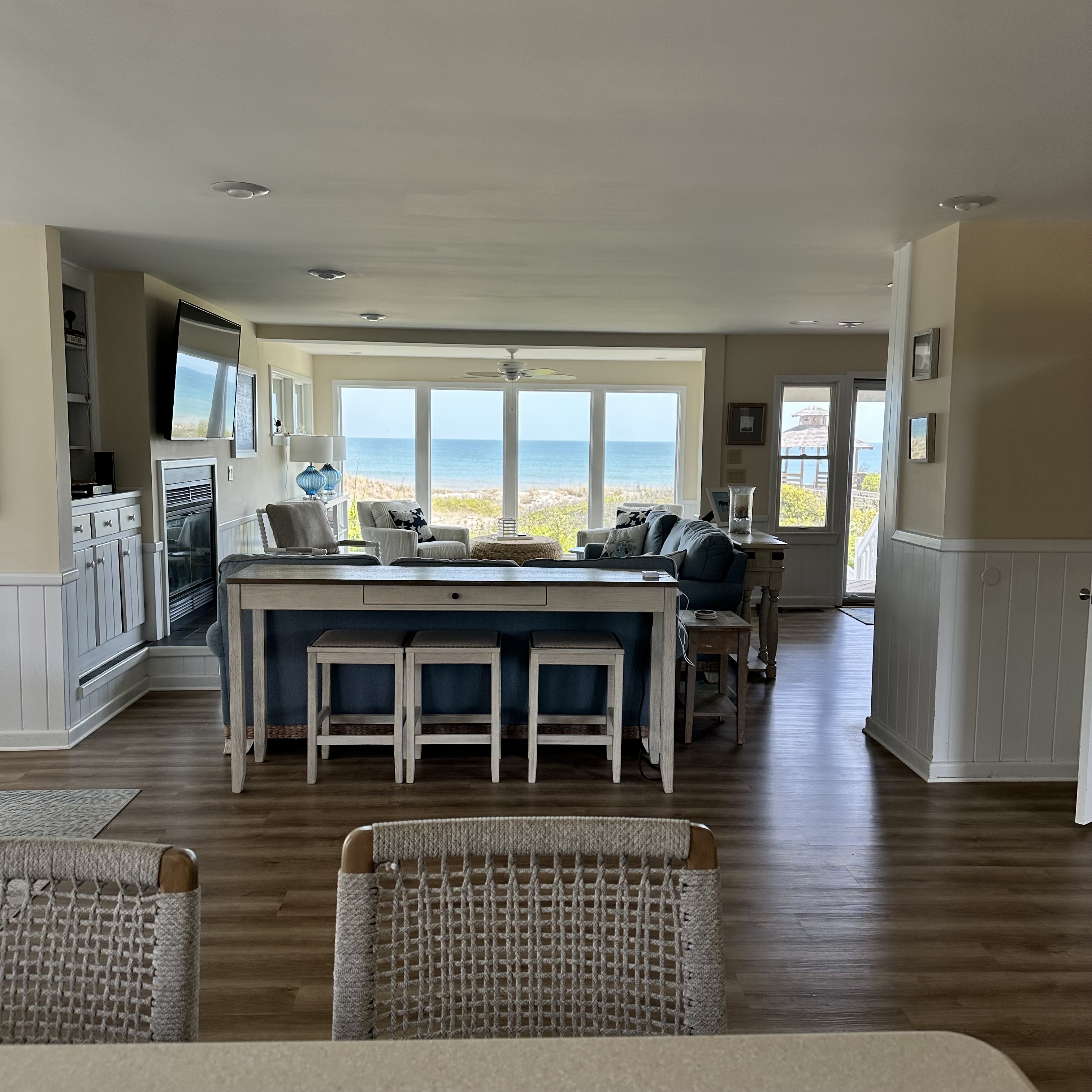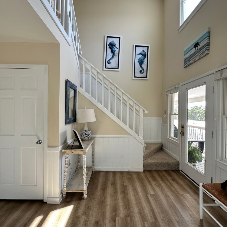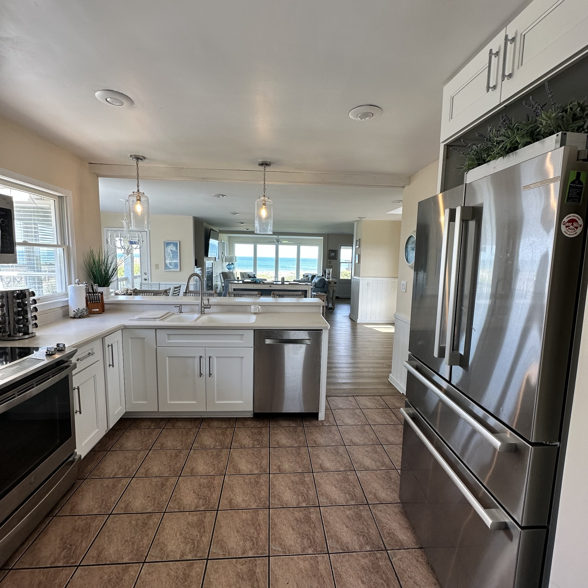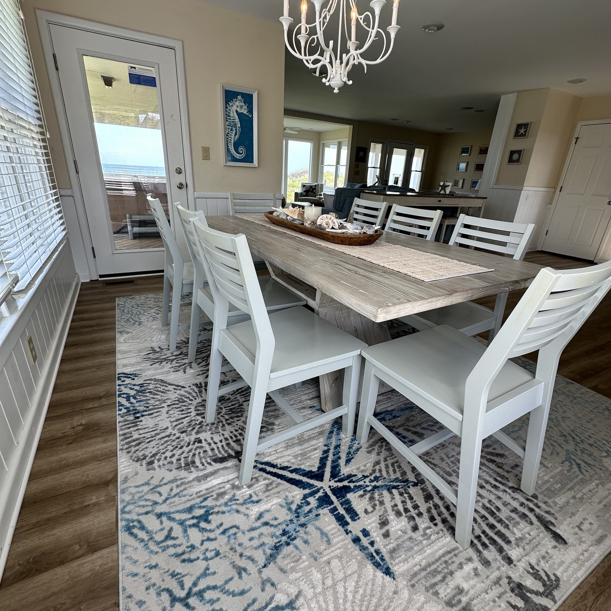 The house was recently updated in 2023 with new flooring, a new dining table/ chairs, new kitchen & bar cabinets, and bar stools that lead to a well-equipped kitchen with stainless steel appliances and new kitchen cabinets. The attractive kitchen is fully equipped with all that you need to prepare meals during your vacation. Watch the waves and dolphins while preparing meals and enjoy them together in the dining area, or dine outdoors on the screened porch. Outside, the expansive wrap-around decks are a highlight of the home. A mixture of outdoor furniture and built-in bench seating can be found throughout the deck. Enjoy your morning coffee with a beautiful sunrise over the ocean as you relax on the ocean-facing covered deck. The sun deck on the front of the house is also a great place to chat with family and listen to the waves crash nearby.